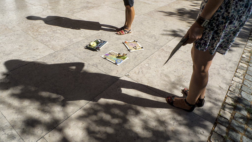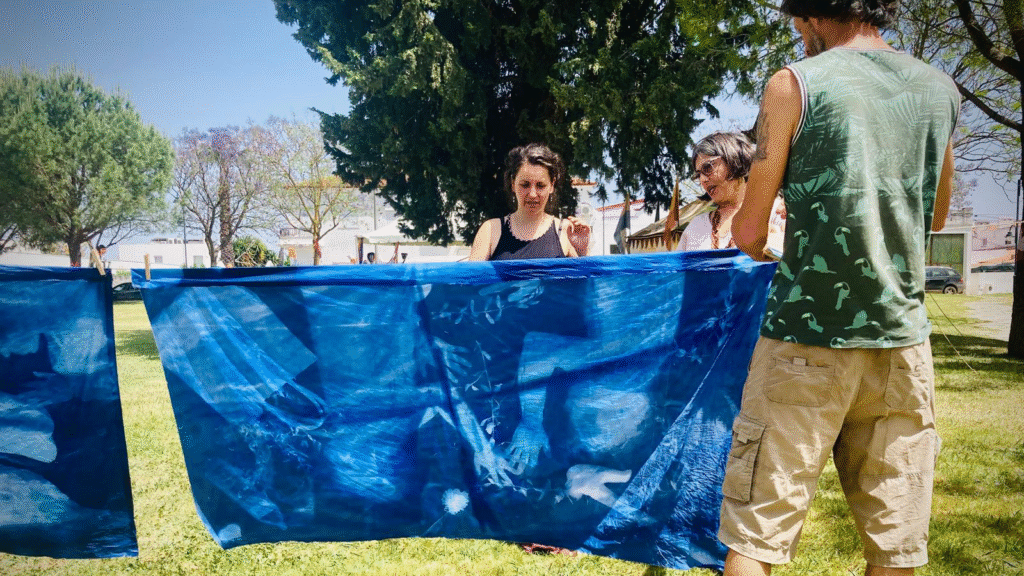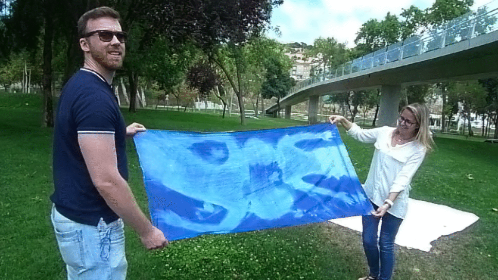 “Estampagem com Água e Sol”: em tecido, e orientada para questões da reciclagem